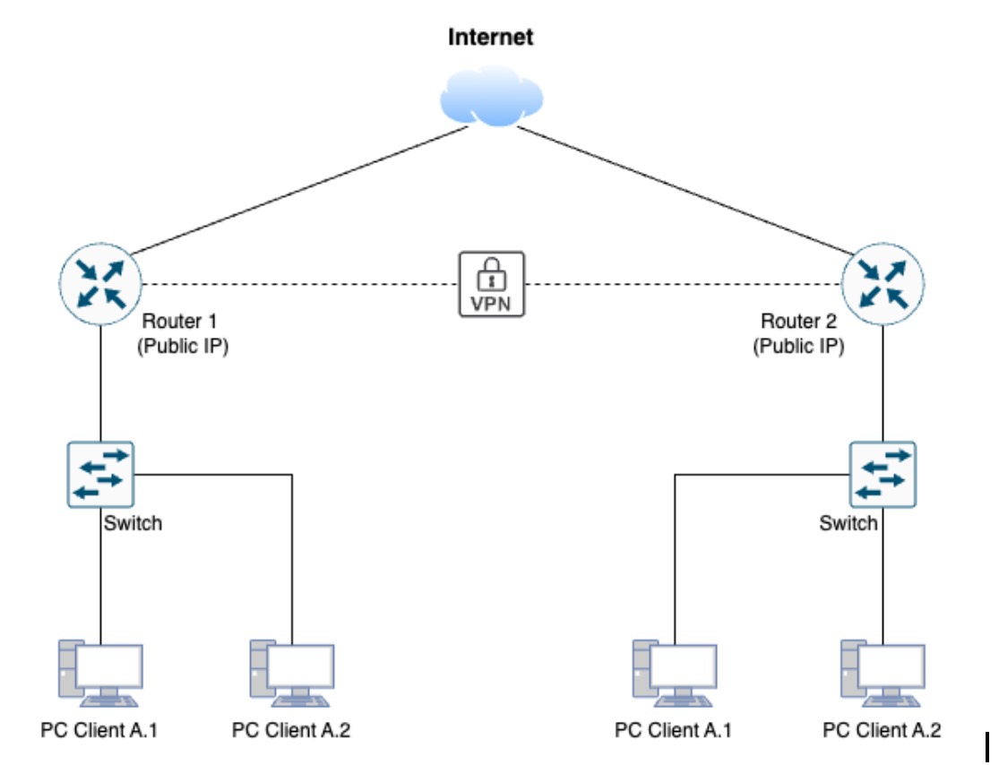 Melalui VPN ini, setiap site dapat mengakses jaringan lokal lainnya sesuai dengan kebijakan yang diterapkan oleh administrator. Hal ini memastikan bahwa hanya pihak yang berwenang yang dapat mengakses data sensitif, sambil tetap mendukung efisiensi operasional di seluruh cabang dan pusat.