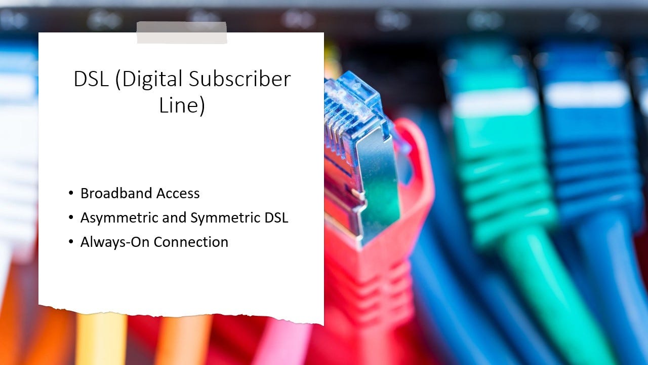 DSL (Digital Subscriber Line) adalah teknologi yang digunakan untuk mentransmisikan data digital melalui jaringan telepon yang sudah ada. Teknologi ini memungkinkan pengguna untuk mengakses internet dengan kecepatan yang lebih tinggi dibandingkan modem dial-up tradisional, tanpa harus memutus koneksi telepon saat digunakan.